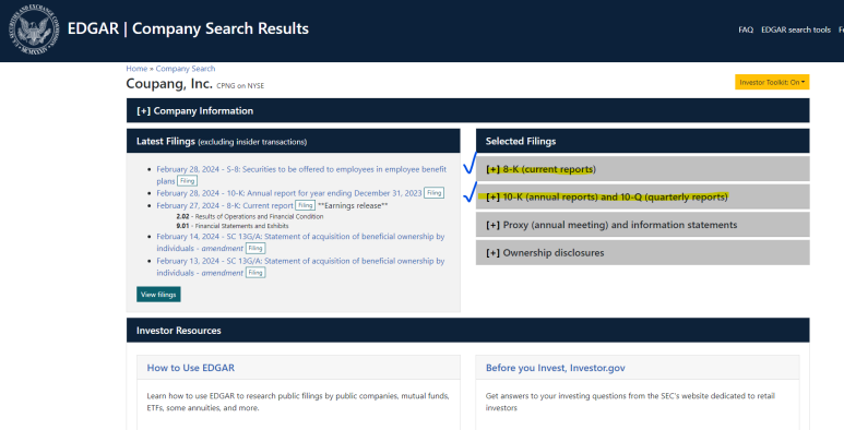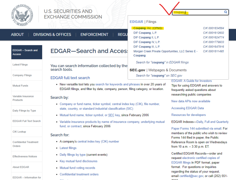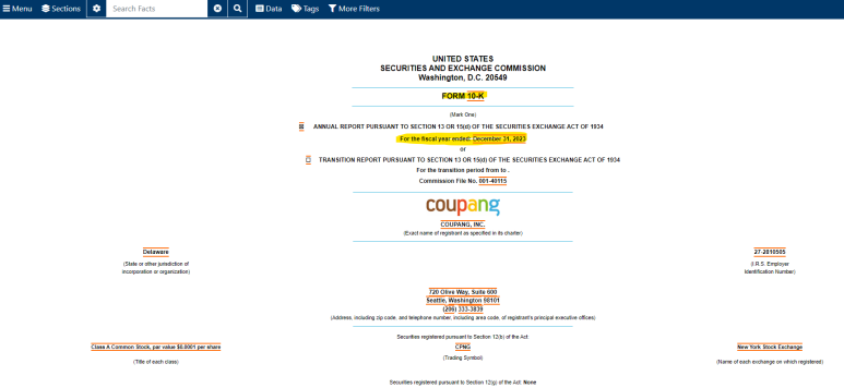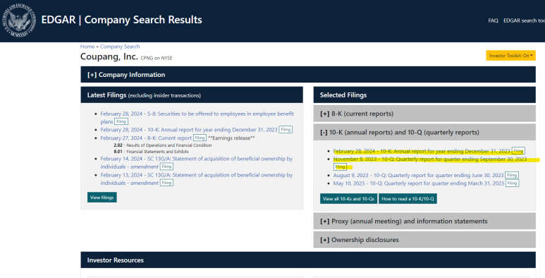미국 공시는 우리나라 공시보다 좀 더 빠르게 올라오는 경향이 있습니다. 일단 쿠팡의 보고서를 예시로 검색해보면,
