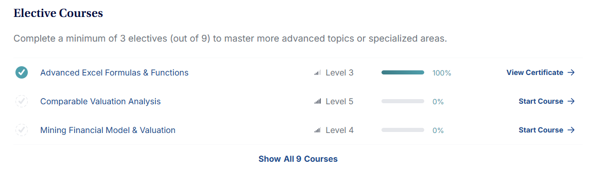 Elective Courses는 선택 과목의 개념으로 준비되어 있는 9개의 코스중에서 3개 이상 이수하면 최종 시험을 볼 자격이 주어집니다. 선택과목도 탐나는 과목이 많았지만 일단 저는 빠른 자격증 취득을 원하고 있었기에 개인적으로 자신이 있는 Excel과 관련한 기술적인 강의 등 부담이 적은 강의를 택했습니다.